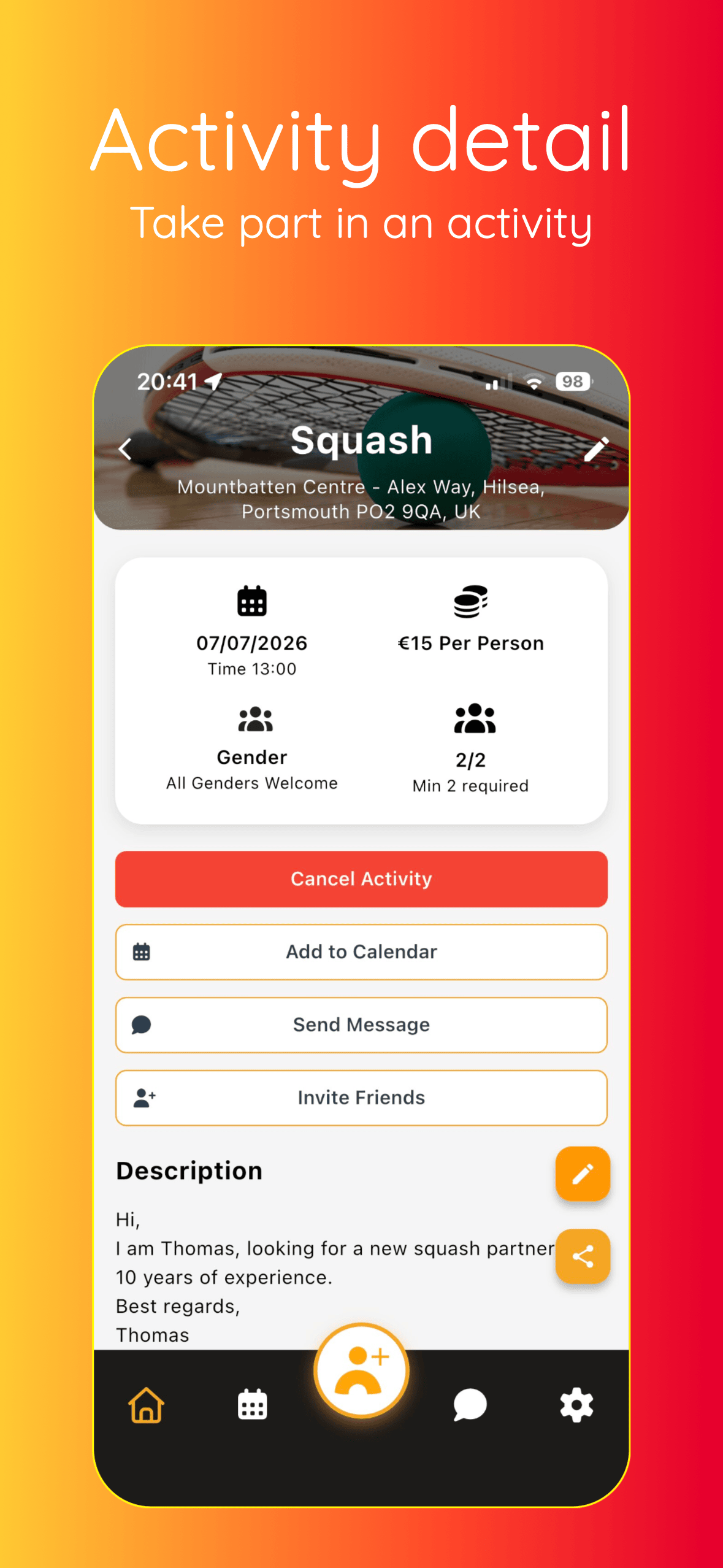 I enjoy playing squash, but it is sometimes difficult to find a partner. Through Djibble, I quickly set up an activity and received a response even faster from someone who was also eager to play squash. After a short conversation, ...